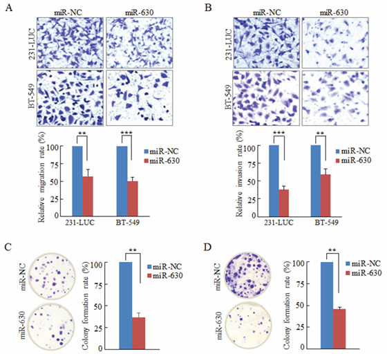 Figure 2: Ectopic expression of miR-630 suppresses Transwell migration, Matrigel invasion and colony formation in breast cancer cells in vitro. A. Transwell migration assay measuring breast cancer cell migration in 231-LUC (top) and BT-549 (bottom) transiently transfected with miR-NC or mature miR-630 mimics, respectively. B. Matrigel invasion assay measuring breast cancer cell invasion in 231-LUC (top) and BT-549 (bottom) transfected with miR-NC or mature miR-630 mimics. Data represent mean ± SD of nine randomly selected areas from three independent experiments. C, D. Analysis of colony formation in 231-LUC cells (C) and BT-549 cells (D) transiently transfected with miR-NC or mature miR-630 mimics, respectively. **P < 0.01; ***P < 0.001. All experiments were repeated independent three times.