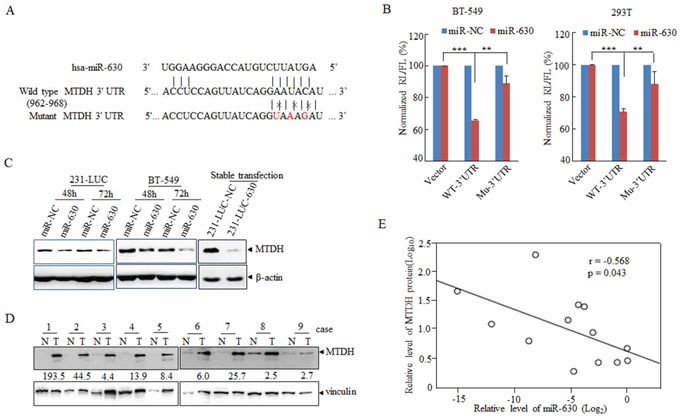 Figure 3: MiR-630 targets MTDH directly in breast cancer cell lines. A. A schematic diagram illustrating the miR-630-binding sites and 3 mutated bases in MTDH 3′UTR. B. Dual-luciferase assays showing repression of wild-type UTR or mutant UTR following transfection of miR-630 or NC http://mimics.in BT-549 (Left) and HEK293T (Right) cells. Data represent mean ± SD. *P < 0.05; **P < 0.01; ***P < 0.001; All experiments were repeated independently three times. C. Western blot analysis showing the depression of MTDH in breast cancer cell lines 231-LUC (Left) and BT-549 (Right) transfected with miR-NC or miR-630 with β-actin as a loading control. D. Western blot describing the MTDH expression in clinical specimens with vinculin as a loading control. The folds change indicated the MTDH expression in tumors against paratumor normalized to vinculin. E. Expression and correlation of miR-630(Log2) and MTDH (log10) in paired clinical breast cancer samples.