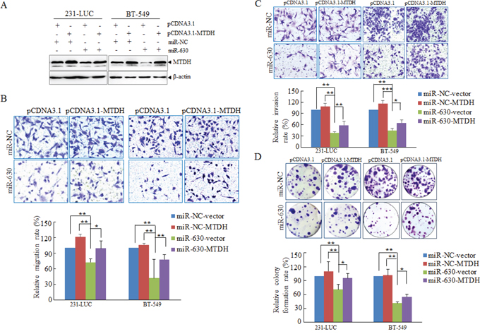 MTDH is involved in miR-630-regulated migration, invasion as well as colony formation