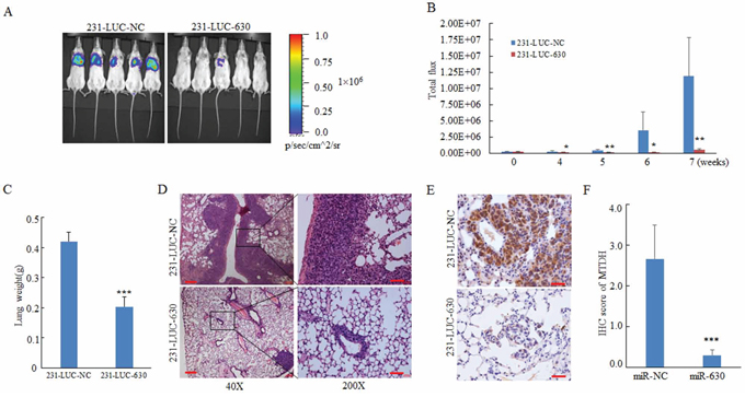 Figure 6: MiR-630 suppresses metastasis in a xenograft mouse model. A. IVIS luciferase in vivo images of lung metastasis. B. Representative lung metastasis burden of xenografted animals on day 0, 14, 21, 28, 35, 42, 49 after injected with 231-LUC-NC cells or 231-LUC-miR-630 cells.; lung metastasis models were established (n = 6 per group) as described in “Materials and methods” and lung metastasis burden of xenografted animals were monitored using bioluminescent imaging (BLI). C. Lung tissue weight of the mice sacrificed on the day 49. D, E. Representative H&E staining (D) and MTDH immunohistochemical staining (E) of lung sections were performed on day 49 after cell injection. Scale bar, 50 μm. Lung tissues were fixed with 4% paraformaldehyde immediately after isolated for standard immunohistochemistry analysis as standard immunohistochemistry protocol. F. The IRS scores of MTDH expression in lung sections of mice orthotopically injected with 231-LUC-NC or 231-LUC-miR-630 cells. Data represent mean ± SD. *P < 0.05; **P < 0.01; ***P < 0.001.