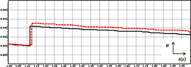 Also, as it can be seen in the Hurst exponent plot, the value of the Hurst exponent in case of subject 1 and subject 2 experiences a sudden upward deflection. In case of subject 1 and subject 2, the value of the Hurst exponent is decreasing in the time span of t = 1 s to t = 1.118 s and t = 1 s to t = 1.127 s respectively; After that, a sudden upward deflection can be seen, which stands for experiencing the visual stimulus and increasing the memory, and again the trend shows the same behaviour. The overall decreasing behaviour stands for the phenomenon that when a longer time span is considered, the less the human brain “remembers” its initial state [29].