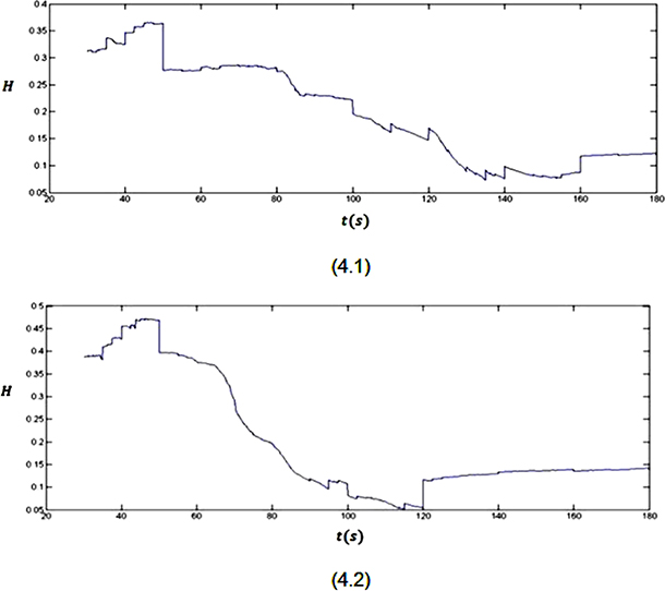As it is clear in plot 4.1, a sudden downward deflection at about t = 50 s can be seen. Considering the subject is resting without receiving any external stimulus, the mentioned sudden deflection can only be related to an internal stimulus. In fact, this stimulus later, at about t = 80 s, causes the brain to have an abnormal activity (epileptic seizure). After this stimulus till the end of seizure (t = 50 s to t = 160 s), the value of the Hurst exponent decreases from 0.5. But, because these values are between 0 and 0.5, a good correlation between the values of the signal cannot be seen. When the brain goes back to its normal status (after t = 160 s), a sudden upward deflection can be seen in the plot, which increases the values of the Hurst exponent. Although this upward deflection sometimes is small, but it is the beginning of the process which increases the values of the Hurst exponent. As it was mentioned previously, this behaviour stands for the phenomenon that when a longer time span is considered, the less the human brain “remembers” its initial state. The mentioned behaviour also can be seen in plot 4.2. In this plot the seizure onset is clear by the downward deflection at t = 50 s. The seizure ends by the upward deflection at t = 120 s in this plot.