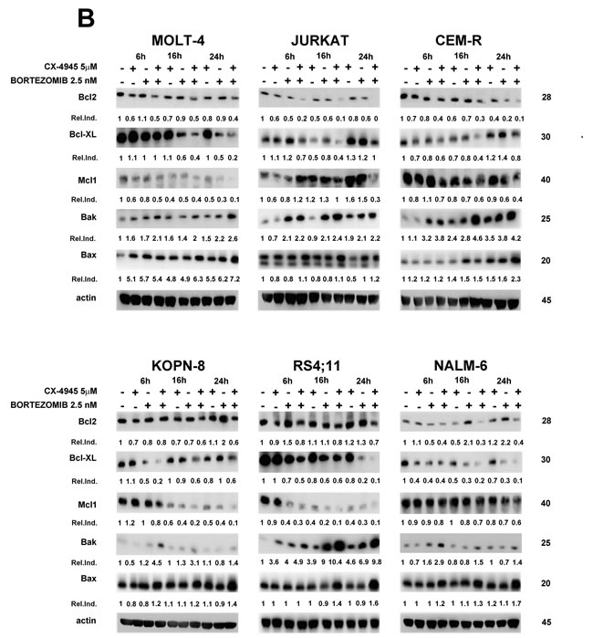 Apoptosis induction was further assessed by western blot analysis of caspase-8, caspase-3 and poly (ADP-ribose) polymerase (PARP) cleavage. The drug combination was able to induce a more significant time-dependent cleavage of the three proteins, compared to single agent treatment. The time of maximum cleavage was different, depending on the cell line (Figure 2A). Cleaved PARP was quantified using densitometry scanning and results were showed as Relative Induction values (Rel.Ind.), the amount of protein present in treated samples relative to untreated cells after normalizing to actin band density. Given the roles played by both bortezomib [23, 35] and CX-4945 [26, 32] in ER stress/UPR mechanisms, we also analyzed in MOLT-4, KOPN-8 and RS4;11 cells, caspase-4 cleavage, a known marker of ER stress [36]. After 16 h of treatment, the drug combination caused a more marked cleavage than single drugs (Figure 2A). Mitochondrial involvement was also investigated through western blot analysis of Bcl-2 family members expression. As shown in Figure 2B, bortezomib/CX-4945 combination caused a time-dependent reduction of anti-apoptotic Bcl-2, Bcl-XL and Mcl1 as compared with single treatments, to a different extent depending on the cell line. In particular, in T-ALL cells and in NALM-6 cells, Bcl-2 down-modulation occurred already after 6 h of treatment, while in KOPN-8 and RS4;11 the decrease was detected after 24 h of treatment. Bcl-XL decreased already after 6 h in all cell lines. The same occurred for Mcl1 expression, except in JURKAT cells where, after 6 h of combined treatment, Mcl1 level increased and then decreased at 16 and 24 h, as confirmed by Rel.Ind. values. Pro-apoptotic Bax accumulation could be observed after 24 h of combined treatment, while Bak increase occurred earlier, already after 6 h of treatment. To better analyze mitochondrial involvement, we studied mitochondrial membrane potential by flow cytometry analysis of JC-1 dye [37] in RS4;11 cell line. As shown in Supplementary Figure S1, after 16 h of treatment, the drug combination was able to diminish red JC-1 fluorescence more than single treatments. Taken together, our findings indicated that bortezomib and CX-4945 cooperated to induce apoptotic cell death in ALL cells. Disrupted balance of Bcl-2 family members, mitochondrial depolarization and caspase-4 cleavage suggested the involvement of both mitochondrial and ER-stress mechanisms, respectively. The cleavage of caspase-8 could suggest the involvement of death receptor mechanism, therefore this pathway needs to be studied in more depth.