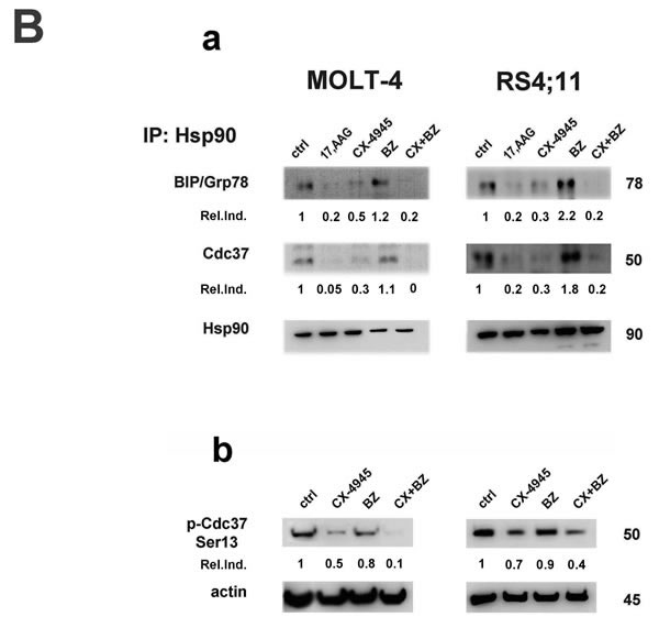 Figure 3: Bortezomib/CX-4945 combination modulates ER stress/UPR signaling in T- and B-ALL cell lines. BIP/Grp78 depletion is provoked by impairment of Hsp90 chaperoning activity A. Western blot analysis documenting the time-dependent modulation of ER stress/UPR signaling markers induced by CX-4945 (5 µM) and bortezomib (2.5 nM) either alone or in combination (6 h of pre-treatment with bortezomib, followed by adding of CX-4945 for 6, 16 and 24 h). Fifty μg of protein was blotted to each lane. Antibody to β-actin served as a loading control. Molecular weights are indicated at right. Ser51 p-EIF2α Relative Induction values (Rel.Ind.) were obtained by normalizing to EIF2α density. Ba. Western blot analysis of immunoprecipitated Hsp90/BIP complexes in MOLT-4 (T-ALL) and RS4;11 (B-ALL) treated for 22 h with CX-4945 (5 µM) and bortezomib (2.5 nM) either alone or in combination (6 h of pre-treatment with bortezomib, followed by adding of CX-4945 for 16 h). 500 μg of protein lysates were immunoprecipitated with anti-Hsp90 antibody and then analyzed with the indicated antibodies. Relative Induction values (Rel.Ind.) were obtained by normalizing to Hsp90 bands density. Bb. Western blot analysis of Ser13 p-Cdc37 expression in MOLT-4 and RS4;11 cells treated for 22 h as previously described. Fifty μg of protein was blotted to each lane. Antibody to β-actin served as a loading control. Molecular weights are indicated at right. Ctrl, untreated cells; 17-AAG, tanespimycin; BZ, bortezomib; CX+BZ, drugs combination.