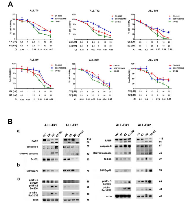 Figure 6: The Bortezomib/CX-4945 combined treatment is cytotoxic to primary lymphoblasts from T- and B-ALL patients, affects ER stress/UPR signaling and activates NF-κB pro-apoptotic functions. A. MTT assays performed on primary cells from 3 pediatric T-ALL and 3 pediatric B-ALL patients treated for 46 h total with either one drug alone or with a combination (6 h of pre-treatment with bortezomib, followed by adding of CX-4945 for 40 h) of the two drugs at a constant ratio of 1:1000 (bortezomib:CX-4945). The combined treatment resulted in a strong synergism (CIs 0.1-0.3), synergism (CIs 0.3-0.7) or moderate/slight synergism (CIs 0.7-0.9); data are representative of three independent experiments, bars, s.d., CX, CX-4945; BZ, bortezomib. B. Western blot analysis of proteins extracted from two of T-ALL and two of B-ALL patient lymphoblasts, documenting a. the induction of apoptosis confirmed by cleavage of PARP, activation of caspase-8, and inhibition of Bcl-xL levels b. UPR inhibition, confirmed by BIP/Grp78 depletion, except for ALL-B#2 c. NF-κB pro-apoptotic activation, documented by induction of Ser536 p-NF-κB and Ser32/36 p-IκBα. Fifty μg of protein was blotted to each lane. Antibody to β-actin served as a loading control. Molecular weights are indicated at right. Ctrl, untreated cells; CX, CX-4945; BZ, bortezomib; CX+BZ, drugs combination.