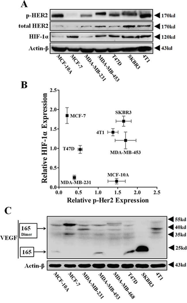 Figure 1: The protein expressions of p-HER2 (Tyr 1221/1222), total HER2, HIF-1α and VEGFA of various breast cancer cells. A. Immunoblotting for protein expressions of total HER2, p-HER2 and HIF-1α in normoxia. 100 μg protein per lane. B. Representative scatter-plot revealing the relationship between the protein levels of p-HER2 and HIF-1α in various breast cancer cells (n = 3). C. Immunoblotting for VEGFA expression in various breast cell lines. The main VEGFA isoform, VEGF165, and its homodimers were respectively detected at 23 kD and 38 kD.