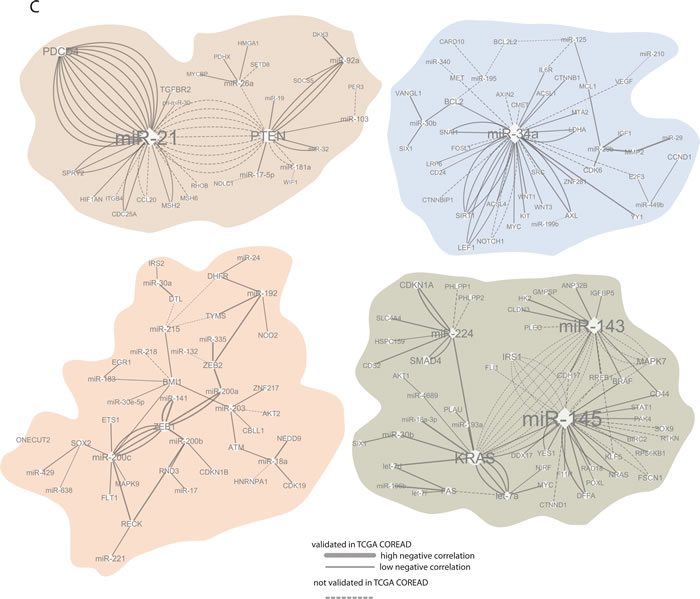 So far only one study addressed regulation of miR-9 and its direct repression of CDH1 was confirmed at the protein level in CRC [38]. We previously showed that miR-9 was downregulated at early CRC stages and that its re-expression reduced cell proliferation [39]. However, our and others attempts to establish CDH1 as miR-9 target in CRC at the mRNA level have failed. This is most likely explained by the fact that miR-9 inhibit CDH1 translation. Nonetheless, an inverse expression pattern is observed between multiple miRNAs reported to be in control of metastatic progression and selected EMT regulators in TCGA CRC patients [40] (Figure 2B).