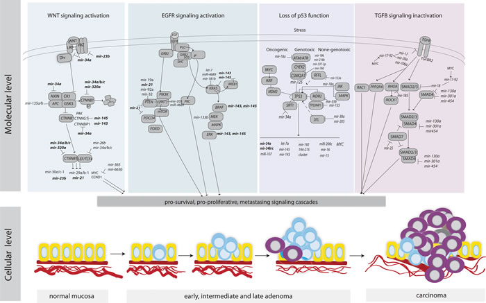 In this review, we summarize miRNAs that are relevant to CRC, describe research that has led to better understanding of the miRNA function and highlight miRNA involvement in the major signaling pathways.