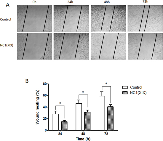 Figure 1: NC1(XIX) inhibits migration of SK-MEL-28 melanoma cells. (A) SK-MEL-28 cells were seeded in 12-well plates. Cell layer was scratched with a pipet tip and then incubated with or without 20 μM of NC1(XIX) up to 72 h at 37°C. Wound closure was measured by microscopy at 0, 24, 48, 72 h respectively. (B) Wound closure was significantly delayed after NC1(XIX) treatment compared to control. Histogram represents the mean ± SEM of 4 replicates. *Significantly different from control (*p < 0.05).