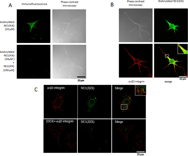 Figure 3: NC1(XIX) colocalizes with the αvβ3 integrin in SK-MEL-28 melanoma cells. (A) Fluorescent microscopy visualization of biotinylated NC1(XIX) on the cell surface of SK-MEL-28 melanoma cells (top panel). Competition between NC1(XIX) and biotinylated NC1(XIX) (low panel). (B) Fluorescent microscopy visualization of biotinylated NC1(XIX) (green) and αvβ3 integrin (red). Yellow staining corresponds to areas where biotinylated NC1(XIX) and anti-αvβ3 integrin colocalize. Cells were cultured on glass slides, fixed with paraformaldehyde and labeled with biotinylated NC1(XIX) peptide and anti-αvβ3 integrin antibody. Scale bar: 20 μm. (C) SK-MEL-28 melanoma cells were cultured on glass slides, fixed with paraformaldehyde and incubated with biotinylated NC1(XIX) peptide and anti-αvβ3 integrin antibody (23C6).