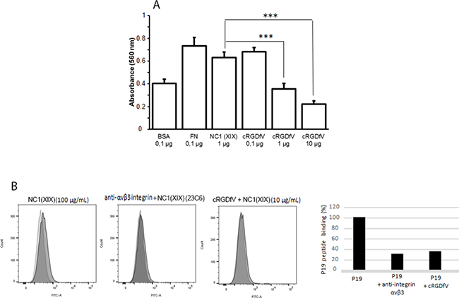 Figure 4: cRGDfV blocking peptide inhibits the NC1(XIX) binding on αvβ3 integrin. (A) Effect of cRGDfV blocking peptide on SK-MEL-28 cell adhesion. Cells were preincubated in DMEM containing 0.1, 1 or 10 μg/mL of cRGDfV blocking peptide for 30 min at 37°C and then incubated in wells coated with 1 μg of NC1(XIX) for 2 h at 37°C. After washing, cells were fixed with glutaraldehyde and stained with crystal violet. Absorbance was read at 560 nm. The values are the means ± SD of 4 replicates. *Significantly different from control (***p < 0.001). (B) Flow cytometry studies showed NC1(XIX) peptide (100 μM) binding on SK-MEL-28 cell surface. (C) NC1(XIX) peptide (100 μM) binding was inhibited by the addition of αvβ3 integrin antibody (LM609) or cRGDfV blocking peptide.