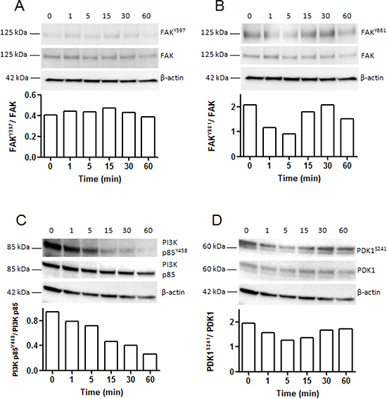 Figure 5: Kinetic analysis of FAK, PI3K p85 subunit of PI3 kinase and PDK1 phosphorylation in SK-MEL-28 melanoma cells after incubation with NC1(XIX). Western blot analysis of: (A) phosphorylated-FAKY397, (B) phosphorylated-FAKY861, (C) phosphorylated-PI3K p85Y458 and (D) phosphorylated-PDK1S241 compared to total FAK, total PI3K p85 and total PDK1 expression respectively after incubation of SK-MEL-28 melanoma cells with NC1(XIX) for 0, 1, 5, 15, 30 and 60 min. Bands were quantified by densitometric analysis. Phosphorylated protein was reported to corresponding total protein.