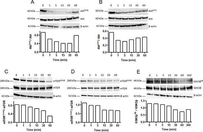 Figure 6: Kinetic analysis of Akt, mTOR and GSK3β phosphorylation in SK-MEL-28 melanoma cells after incubation with NC1(XIX). Western blot analysis showing expression of: (A) phosphorylated-AktT308, (B) phosphorylated-AktS473, (C) phosphorylated-mTORS2448, (D) phosphorylated-mTORS2481 and (E) phosphorylated-GSK3βS9 compared to total Akt, total mTOR and total GSK3β expression, respectively, after incubation of SK-MEL-28 melanoma cells with NC1(XIX) for 0, 1, 5, 15, 30, 60 and 360 min. Bands were quantified by densitometric analysis. Phosphorylated protein was reported to corresponding total protein.