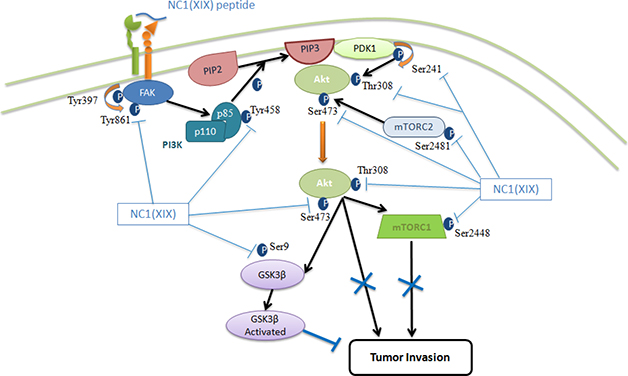 Phosphorylation by the PI3K activating subunit is important, especially for the migration and growth of tumor cells [41, 42]. Our results show that NC1(XIX) inhibits the phosphorylation of the regulatory subunit p85 of PI3K on tyrosine 458. Activated FAK was reported to phosphorylate the downstream PI3K that, in turn, activates Akt [43]. Akt is a central enzyme in tumor invasion, which participates in the regulation of all stages of tumor development [44]. Inhibition of PI3K and Akt promoted anoikis and decreased melanoma tumor growth by inhibiting the Rho subfamily [45]. PDK1 (phosphoinositide-dependent kinase 1) and the complex mTORC2 activates Akt through threonine 308 and serine 473 phosphophylations, respectively [43, 46].