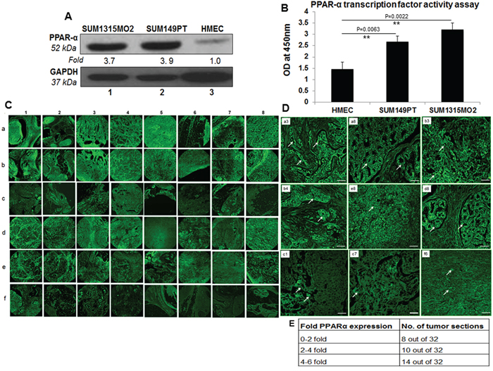 Figure 1: PPARα levels in human breast cancer cell lines and tissue samples. A. Lysates prepared from SUM1315MO2, SUM149PT, and HMEC cells were tested for the protein levels of PPARα. The blots were re-probed with anti-GAPDH antibody to confirm equal loading. A representative blot from three independent experiments is shown. B. PPRE binding activity of PPARα. HMEC, SUM149PT and SUM1315MO2 nuclear extracts were prepared and tested for their ability to bind specifically to the immobilized PPRE in an ELISA based test. Results represent the absorbance measured at 450nm, and are the mean ± SD of three separate experiments from three different preparations for each condition. ** represent statistically highly significant. C. 16 breast cancer tissue samples, in duplicates (a,b,d,e) along with their controls (c,f) were analyzed by IHC staining for PPARα. Magnification for the panels is 4X. D. Magnified view (60X) of PPARα staining in selected human breast cancer tissue samples. White arrows indicate PPARα staining. Scale bar = 20 μm. E. Fold change of PPARα staining in tumor sections. Sections shown in C were further analyzed by measuring fold expression using densitometric analysis. Fold expression was calculated by considering staining in control sections as one fold.
