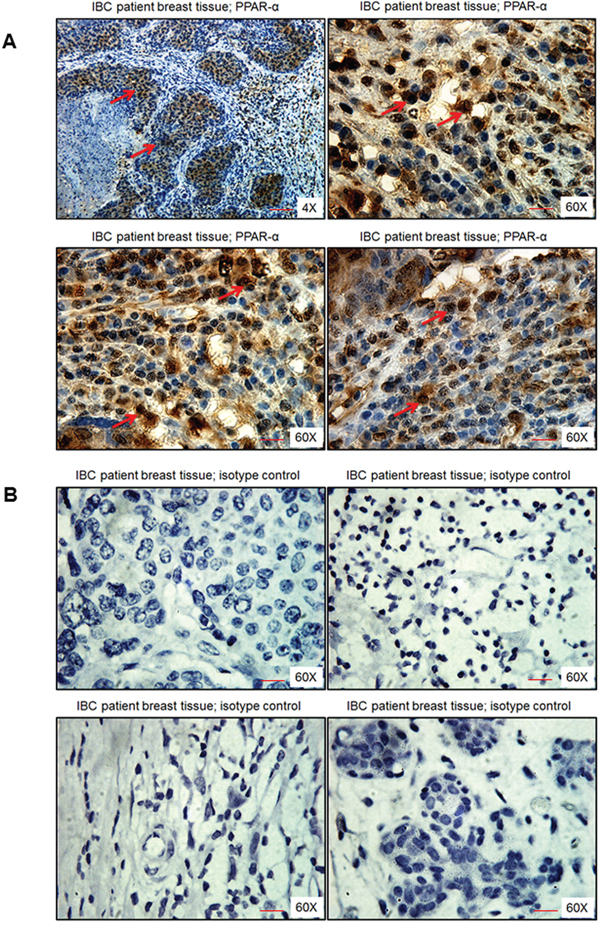 Figure 2: PPARα levels in human breast tissue obtained from IBC patients. Breast tissue section was stained with either A. PPARα antibody or B. isotype control antibody for PPARα. Magnification 4X and 60X. Red arrows indicate PPARα staining. Scale bar = 20 μm.