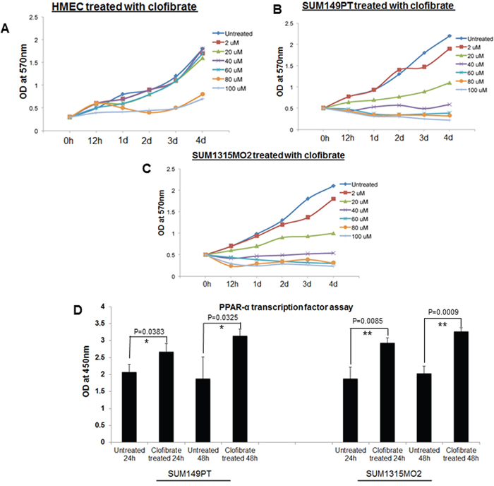 Figure 4: Effect of clofibrate treatment on cell proliferation. MTT cell proliferation assay was performed in A. HMEC, B. SUM149PT, and C. SUM1315MO2 cells, which were treated with clofibrate as indicated, and the levels of tetrazolium MTT was measured by a spectrophotometer at 570nm. D. Effect of clofibrate treatment on PPRE binding activity of PPARα in breast cancer cell lines. SUM149PT and SUM1315MO2 cells were treated for 24 h and 48 h with 20 μM clofibrate and nuclear extracts were prepared and tested for PPRE binding activity. Results represent the absorbance detected at 450nm. Readings are the mean ± SD of three separate experiments from three different preparations for each condition. * denotes statistically significant and ** represents statistically highly significant.