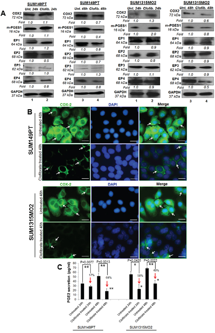 Figure 5: Effect of clofibrate treatment on the cyclooxygenase pathway. Lysates prepared from A. SUM149PT and SUM1315MO2 cells untreated or treated with 20 μM clofibrate for 24 h and 48 h were Western blotted for COX-2, mPGES-1, EP1, EP2, EP3, EP4 and then stripped and re-probed with anti-GAPDH antibody to confirm equal loading. B. COX-2 immunostaining in SUM149PT and SUM1315MO2. SUM149PT and SUM1315MO2 cells were untreated or treated with 20 μM clofibrate for 48 h in eight-well chamber slides and then collected, permeabilized, and stained with an anti-COX-2 monoclonal antibody. Magnification, 40X. DAPI (Blue) was used as a nuclear stain and merged with COX-2 staining. Scale bar = 20 μm. C. Effect of clofibrate treatment on PGE2 secretion. Cell free culture supernatants of SUM149PT and SUM1315MO2 untreated or treated with 20 μM clofibrate for 24 h and 48 h were used to measure PGE2. Percent inhibition of PGE2 secretion was calculated by considering the secretion from untreated cells as 100%. * denotes statistically significant and ** represents statistically highly significant.