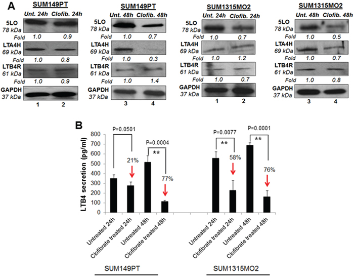 Figure 6: Effect of clofibrate treatment on the 5-lipooxygenase pathway in SUM149PT and SUM1315MO2 cells. A. SUM149PT and SUM1315MO2 cells were untreated or treated with 20 μM clofibrate and cell lysates were prepared. These cell lysates were Western blotted for 5LO, LTA4H, and LTB4R, and then stripped and re-probed with anti-GAPDH antibody to confirm equal loading. B. Effect of clofibrate treatment on LTB4 secretion in SUM149PT and SUM1315MO2 cells. SUM149PT and SUM1315MO2 cells were untreated or clofibrate treated for 24 h and 48 h, and supernatants were collected for LTB4 quantification. Percent inhibition in LTB4 secretion was calculated by considering the secretion from untreated breast cancer cells as 100%. Each bar represents the average +/- SD from three independent experiments. ** represents statistically highly significant.