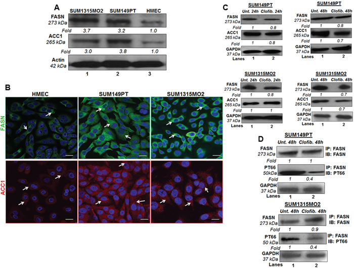 Figure 7: Effect of clofibrate treatment on lipogenic enzymes. A. FASN and ACC1 protein levels in breast cancer cells and HMEC cells. Lysates prepared from SUM1315MO2, SUM149PT, and HMEC cells were tested for the protein levels of FASN and ACC1. The blots were re-probed with anti-Actin antibody to confirm equal loading. B. Immunofluorescence analysis of FASN and ACC1 in SUM149PT, SUM1315MO2, and HMEC cells. Cells were grown to 80%-90% confluence, fixed, permeabilized, and stained with FASN-specific (green) and ACC1-specific (red) antibody. Nuclei were counterstained with DAPI (blue). Magnifications 40X. Scale bar = 20 μm. C. Cell lysates prepared from SUM149PT and SUM1315MO2 untreated or treated with 20 μM clofibrate for 24 h and 48 h were Western blotted for FASN and ACC1 and then stripped and re-probed with anti-GAPDH antibody to confirm equal loading. D. FASN active/phosphorylated protein levels were measured in untreated or clofibrate treated cell lysates. These lysates were immunoprecipitated with anti-FASN antibody and Immunoblotted with either anti-FASN or anti-PT66 antibody. Equal loading was confirmed by anti-GAPDH antibody. Each blot is a representative of three independent experiments.