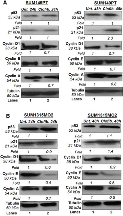 SUM149PT and SUM1315MO2 were untreated or treated with 20 μM clofibrate for 24 h and 48 h. Compared to untreated SUM149PT, a 24 h treatment with 20 μM clofibrate induced no significant changes in protein levels of p53, p21, and cyclin E. Other cyclin kinases such as cyclin D1 and cyclin A had decreased protein levels upon clofibrate treatment (Figure 10). Compared to untreated SUM149PT, a 48 h treatment with 20 μM clofibrate resulted in a significant increase of p21 accompanied by reduction in cyclin D1, cyclin E, and cyclin A with no significant change in p53 level (Figure 10). Compared to untreated SUM149PT, a 24 h treatment with 20 μM clofibrate resulted in no significant changes in protein levels of p53 but decreased levels of p21, cyclin D1, cyclin E, and cyclin A (Figure 10). 48 h treatment of SUM149PT cells with 20 μM clofibrate induced p53 and p21 with a subsequent decrease in cyclin D1, cyclin E, and cyclin A levels (Figure 10). The effects were seen more prominently after the 48 h treatment and were apparent in SUM1315MO2 cells (Figure 10). Overall, results indicate that clofibrate treatment exhibits an anti-proliferative effect on breast cancer cells via regulating the level of tumor suppressors, cell cycle inhibitors, and checkpoint kinases.