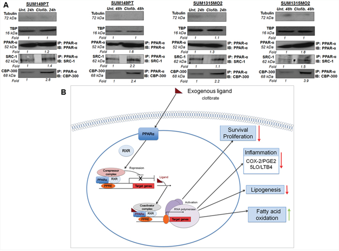Ligand treatment is known to mediate activation of PPARs via dissociation of corepressors and concomitant association with coactivators, such as SRC1 and CBP/p300 [11]. In order to test whether clofibrate treatment activates PPARα via association with coactivators, we prepared nuclear complexes from untreated or 20 μM clofibrate treated SUM149PT and SUM1315MO2 for 24 h and 48 h. Nuclear complexes were tested for their purity by absence of tubulin and presence of the TATA binding protein (TBP) (Figure 12A). Compared to untreated cells, 20 μM clofibrate treated SUM149PT and SUM1315MO2 for 24 h and 48 h nuclear complexes immunoprecipitated with PPARα antibody showed higher expression of SRC1 and CBP/p300 (Figure 12A).