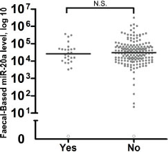 Figure 3: Evaluation of the effects of antibiotics on faecal-based biomarker miR-20a. Patients who took antibiotics within 30 days of specimen collection (n = 26) were compared with patients without any antibiotic intake (n = 162). The lines denote the median. N.S. denotes no statistical significance. miR-20a levels were expressed in number of copies per nanogram of extracted total RNA. Each open circle represents a sample with an undetectable miR-20a level.