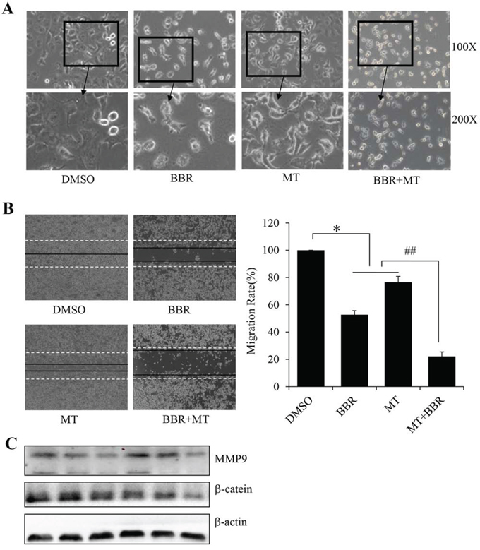 Figure 2: Melatonin enhanced the berberine-mediated cell morphology change and migration inhibition. A. The changes in cell morphology and spreading in H1299 cells treated with melatonin (MT) (1.0 mM) and berberine (BBR) (100 μM) for 24 h were observed, and cells were photographed using a microscope fitted with digital camera. B. Cell migration was analyzed by a scratch assay. H1299 cells were grown to full confluency. The cell monolayers were wounded with a sterile pipette tip, and washed with medium to remove detached cells from the plates. Cells were left either untreated or treated with melatonin (MT) (1.0 mM) and berberine (BBR) (100 μM). After 48 h, the wound gap was observed and cells were photographed. C. Protein levels of MMP9 and β-catein were detected after melatonin and berberine treatment. *P < 0.05, significant differences between treatment groups and DMSO control groups. ##P < 0.05, significant differences between combination treatment and treatment with melatoninor berberine alone.