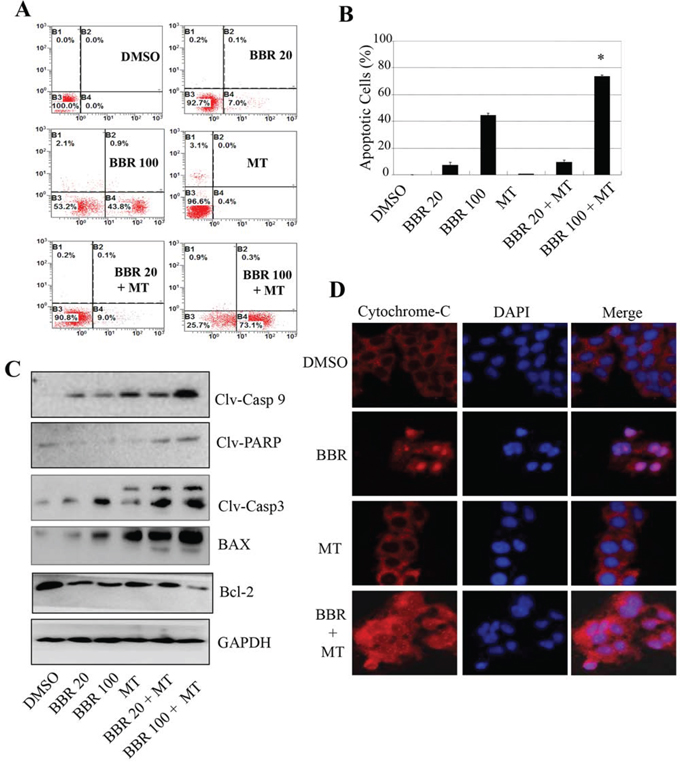 Figure 3: Melatonin enhanced the berberine-induced apoptosis by activating the caspase/cytochrome C signaling. A. H1299 cells were treated with melatonin (MT, 1.0 mM) and berberine (BBR, 100 μM). At 48 hours after treatment, the apoptosis was determined by a FACS analysis, and the apoptosis from three experiments were calculated B. The levels of the cleaved caspase-3, caspase-9, cleaved PARP, BAX and Bcl-2 proteins were analyzed by Western blot C. The release of cytochrome-c was analyzed by immunofluorescence imaging analysis to monitor cytochrome-c release from the inter-mitochondrial space into the cytosol D. The apoptosis are represented by relative percentages of apoptotic cells versus that in DMSO-treated cells. *P < 0.05, significant differences between the BBR/MT-treated groups and the BBR-treated groups.