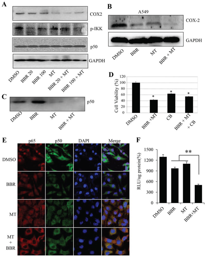 Figure 5: Melatonin enhanced the berberine-mediated inhibition of p50/COX-2 signaling. A. Human H1299 cells were treated with melatonin (MT, 1.0 mM) and berberine (BBR, 20 μM and 100 μM). At 48 hours after treatment, the p-IKK, COX-2 and p50 proteins (A) were analyzed by Western blotting. GAPDH were used as controls for sample loading. B. Human A549 cells were treated with melatonin (MT, 1.0 mM) and berberine (BBR, 50 μM). At 48 hours after treatment, the COX-2 protein was analyzed by Western blotting. C. H1299 cells were pretreated with the COX-2 selective inhibitor celecoxib (CB) (20 μM) for 24 hours, and then treated with melatonin (MT, 1.0 mM) and berberine (BBR, 100 μM). At 48 hours after treatment, cell viability was determined by MTT analysis. The percent cell viability in each treatment group was calculated relative to cells treated with the vehicle control. D. H1299 cells were treated with melatonin (MT, 1.0 mM) and berberine (BBR, 100 μM). At 48 hours after treatment, the binding of p50 to COX-2 promoter probe was analyzed by a streptavidin-agarose pulldown assay. E. H1299 cells grown on chamber slides were treated with melatonin melatonin (MT, 1.0 mM) and berberine (BBR, 100 μM). At 48 hours after treatment, the subcellular localization of p50 and p65 was examined by a confocal microscope. More than 100 cells were inspected per experiment, and cells with typical morphology were presented. F. H1299 cells were treated with melatonin (MT, 1.0 mM) and berberine (BBR, 100 μM) after transfection with COX-2 promoter-driven luciferase plasmids. The luciferase activity was detected by luciferase reporter assay kit. The data are presented as the mean ± SD of three separate experiments. *P < 0.05, significant differences between treatment groups and DMSO control groups.