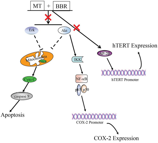 In summary, melatonin sensitized NSCLC cells to berberine and enhanced the growth inhibitory effect of berberine by simultaneously targeting caspase/cytochrome C, AP-2β/hTERT, NF-kB/COX-2, Akt/ERK signaling pathways (Figure 8). These findings provide new insights into understanding the molecular mechanisms by which melatonin sensitizes NSCLC cells to berberine treatment, and suggest some clues for the development of new therapeutic strategies in human lung cancer therapy. Further studies are warranted to more firmly establish this supposition.