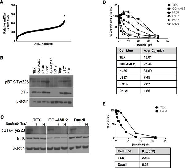 Figure 1: AML cell lines express constitutively active BTK, but are insensitive to ibrutinib. (A) BTK mRNA expression in primary AML cells was determined by analysis of microarray gene expression (GEO accession code: GSE1159). BTK mRNA expression was examined in 267 patients with AML [46]. (B) BTK and pBTK-Y223 expression in AML cell lines was determined by immunoblotting. (C) TEX and OCI-AML2 cells were treated with 1 μM ibrutinib for 1 h or 16 h. pBTK-Y223 and BTK expression in cell lysates was detected by immunoblotting. (D, E) AML cell lines were treated with increasing concentrations of ibrutinib over 72 h and cell growth and viability relative to untreated cells was determined by (D) Alamar Blue or (E) Annexin V and PI staining on flow cytometry. Data depict mean relative viability ± SD from a representative experiment performed in triplicate. Data are representative of three (D) or two (E) independent experiments.