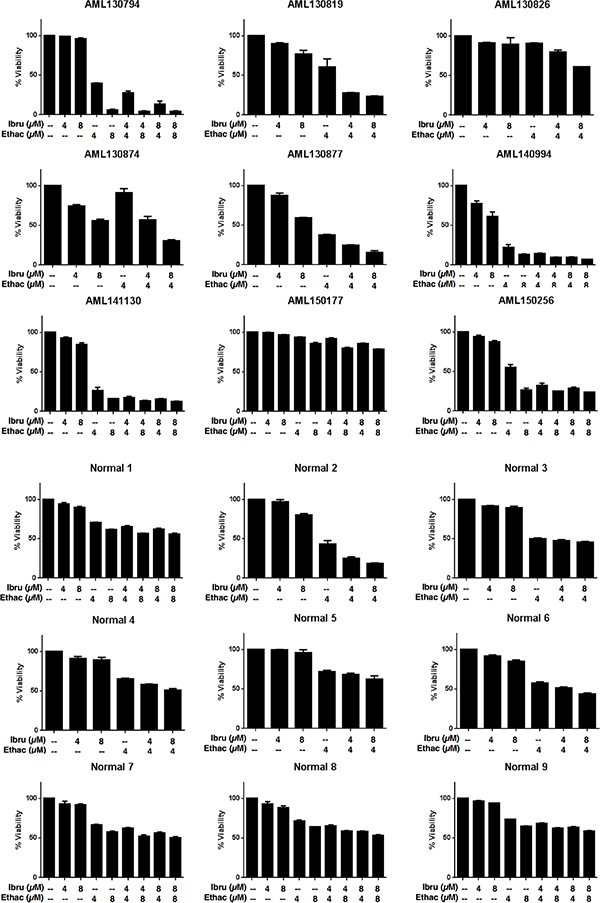 Having identified the combination of ethacridine and ibrutinib as synergistic in AML cell lines, we tested the combination in primary AML cells (n = 9) (see Supplementary Table 1 for patient characteristics) and normal hematopoietic cells obtained from consenting donors of G-CSF mobilized stem cells for allotransplantation (n = 9). Primary cells were incubated with increasing concentrations of ethacridine and ibrutinib for 48 hours in Iscove’s Modified Dulbecco’s Medium supplemented with 10% fetal bovine serum, without additional growth factors, and viability was subsequently measured with Annexin V/PI staining and flow cytometry (Figure 3). Similar to the AML cell lines, ibrutinib had minimal single-agent cytotoxicity, with IC50s exceeding 8 μM in all primary cells. We noted that primary AML cells, on average, were more sensitive to single-agent ethacridine and combination ibrutinib-ethacridine treatment compared to normals: a subset of 6 of 9 AMLs demonstrated greater than 70% cell death from the combination, while only 1 of 9 normals (Normal 2) exhibited similar sensitivity. However, in some normal samples, the drug combination induced ≥ 50% cell death, suggesting that the ibrutinib-ethacridine combination may also have toxicity towards some normal hematopoietic cells.