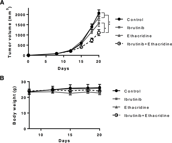 Figure 4: Ibrutinib-ethacridine combination displays anti-AML activity in mice. 1 × 106 OCI-AML2 cells were subcutaneously injected in SCID mice. Eight days after injection, mice were treated with 300 mg/kg of ibrutinib by oral gavage, 20 mg/kg of ethacridine by i.p. injection, a combination of two drugs, or vehicle control (5% DMSO, 20% Cremophor, 0.9% NaCl) by oral gavage on the indicated days. Tumor volume (A) and body weight (B) were monitored over time. Mean ± SEM for tumor volume and mean ± SD for body weight, n = 7. *P < 0.001 and **P < 0.0001 from a two-way ANOVA with Tukey’s posttests comparing all treatment groups at day 18 and 20.
