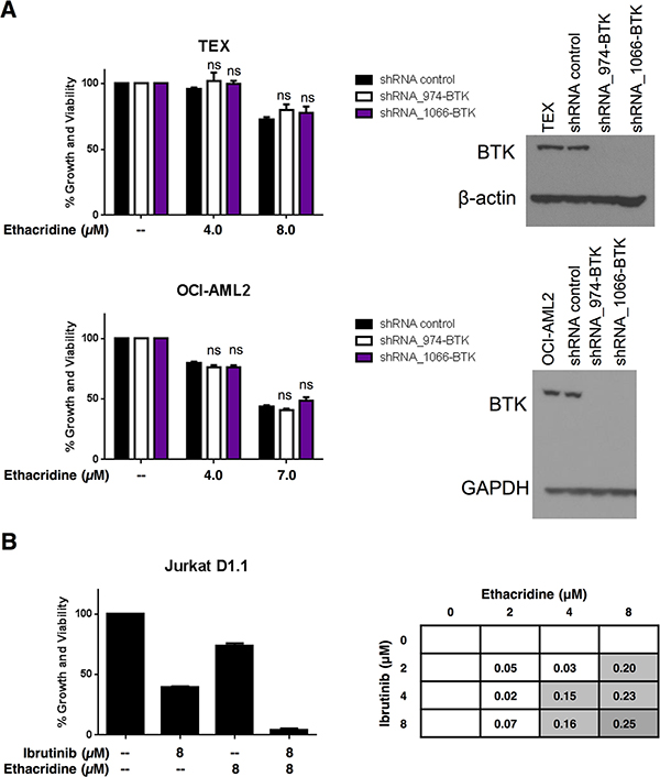 Figure 8: Ibrutinib’s synergy with ethacridine is independent of BTK. (A) TEX and OCI-AML2 cells were transduced with 2 different shRNAs targeting BTK or a non-targeting shRNA control in lentiviral vectors. On day 4 post-transduction, cells were treated with ethacridine at concentrations previously shown to synergize with ibrutinib. Growth and viability at 72 h post-ethacridine treatment was determined by Alamar Blue and calculated relative to untreated control. BTK knockdown was confirmed by immunoblotting. (B) Jurkat cells were treated with increasing concentrations of ibrutinib and ethacridine for 72 h. Cell growth and viability was determined by the Alamar Blue assay and synergy was calculated using the EOBA formula. Data depict mean percent growth and viability ± SD from a representative experiment performed in triplicate. Data in (A) and (B) are representative of two independent experiments. In all panels, ns = not significant, based on the results of an unpaired Student’s t test with Holm-Sidak correction for multiple comparisons (alpha = 5%).