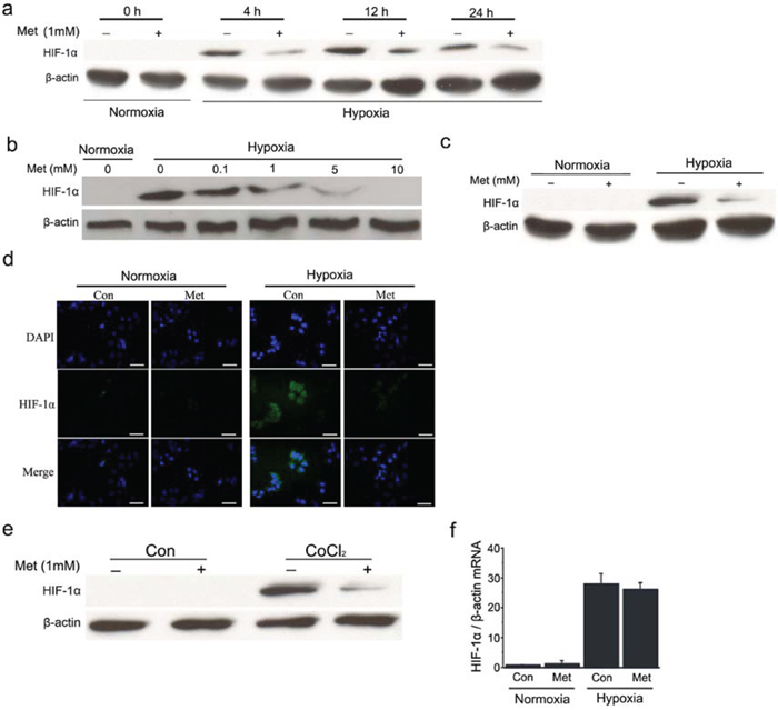 Figure 1: Metformin decreases HIF-1α protein levels in HCC cells. a. and b. Western blot analysis of HIF-1α protein in HepG2 cells treated for different times or with various concentrations of metformin as indicated under normoxia or hypoxia. c. and d. Expression of HIF-1α protein was detected using western blot and immunofluorescence analysis, respectively, in Huh7 cells with or without metformin treatment under normoxic or hypoxic conditions. Scale bars: 50 μm. e. HepG2 cells were pretreated with 100 μmol/L CoCl2 for 3 h before incubation with 1 mmol/L metformin for 12 h and the protein expression of HIF-1α was assayed by western blotting. f. Relative expression of HIF-1α mRNA was examined by real-time RT-PCR in HepG2 cells in the presence or absence of metformin. β-actin was used as the internal loading control. Con, control; Met, metformin.