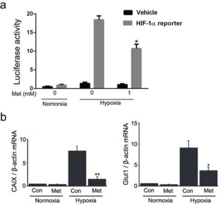 Figure 2: Effect of metformin on transactivation activity of HIF-1α in HepG2 cells. a. Luciferase activity was measured in HepG2 cells that were transiently transfected with a HIF-1α reporter gene and then treated with 1 mmol/L metformin for 12 h under normoxic or hypoxic conditions. *P < 0.05 compared with cells transfected with HIF-1α reporter without metformin treatment in hypoxia. b. Real-time RT-PCR analyses of CAIX and Glut1 mRNA expression in HepG2 cells with or without metformin treatment under normoxic and hypoxic conditions. The relative amounts of CAIX and Glut1 mRNA were normalized to β-actin expression. Hypoxia significantly induced CAIX and Glut-1 mRNA expression in HepG2 cells, and 1 mmol/L metformin inhibited the induction of these mRNAs in hypoxia. *, P < 0.05; **, P < 0.01 compared with control under hypoxic conditions. All experiments were performed three times. Data shown represent the means ± SD. Con, control; Met, metformin.