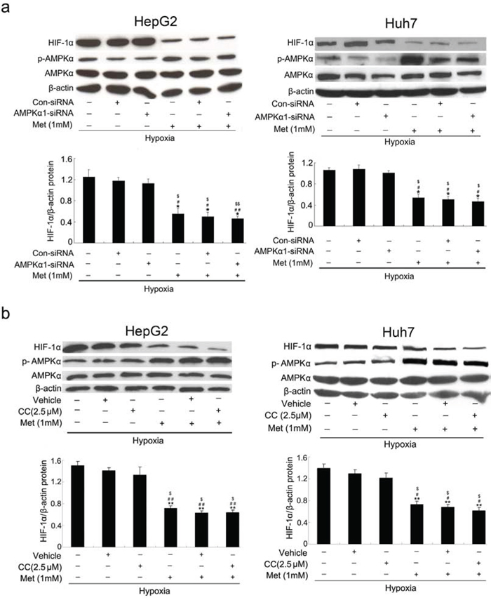 Figure 3: Metformin suppresses HIF-1α protein levels independent of AMPK. a. and b. Western blot analyses of HIF-1α, AMPKα, and phosphorylated form of AMPKα (p-AMPKα). HepG2 and Huh7 cells were transiently transfected with AMPKα1 siRNA or treated with Compound C (CC; AMPK inhibitor), and then incubated with 1 mmol/L metformin for 12 h under hypoxic conditions before immunoblotting with specific antibodies as indicated. β-actin was used as the internal loading control. *, P < 0.05; **, P < 0.01 vs. untreated cells; #, P < 0.05; ##, P < 0.01 vs. control siRNA-transfected or vehicle-treated cells; $, P < 0.05; $$, P < 0.01 vs. AMPKα1-siRNA or CC-treated cells. Results from three independent experiments are shown.