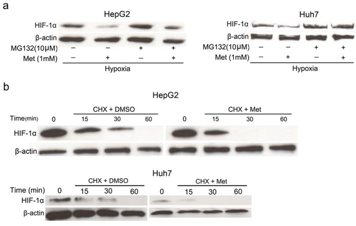 Figure 4: Effects of metformin on protein stability of HIF-1α. a. The proteasomal inhibitor MG-132 (10 μmol/L) rescued the inhibitory effect of 1 mmol/L metformin on HIF-1α protein accumulation in hypoxia. b. HepG2 and Huh7 cells were cultured in hypoxia for 4 h, and then treated with CHX (4 μg/ml; a translational inhibitor) and metformin for 0, 15, 30, and 60 min in normoxia. The results indicated that metformin speeds up the degradation of HIF-1α protein.