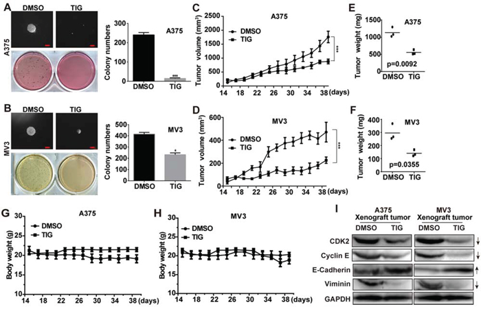 Figure 4: Tigecycline suppressed tumor growth in xenograft model of human melanoma cells. A, B. The colony formation was examined by soft agar assay (1000 cells/well) in A375 or MV3 cells after treating with DMSO or 10 μM tigecycline for 14 to 21 days, Scale bar, 100 μm. C, D. Human melanoma cell A375 and MV3 were injected into the flank of BALA/c nude mice. When tumors were palpable, mice were treated with tigecycline (100 mg/kg) or DMSO every two days for 5 times, and tumor volume was measured. E, F. The weight of xenograft tumors formed by the A375 and MV3 cells which were subsquently treating with tigecycline (100 mg/kg) or DMSO. G, H. The weight of mice was measured after tigecycline treatment. I. Western blot assay was performed to assess cell cycle and EMT-related protein levels in the xenograft tumors of A375 and MV3 melanoma cells; GAPDH was used as a control. All data are shown as the mean ± SD. Student’s t-test was carried out. *p < 0.05, **p < 0.01, ***p < 0.001.