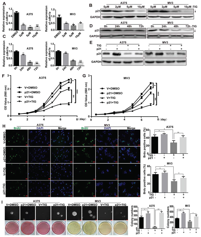 Figure 5: Overexpression of p21 rescued tigecycline-induced cell growth and proliferation inhibition in human melanoma cells. A, C. RT-PCR assay was used to show the expression of cdkn1a (p21) mRNA after tigecycline treatment. B, D. Western blot assay was used to show the expression of p21 after tigecycline treatment. E. Western blot assay was used to show the expression of p21 in DMSO or tigecycline-treated p21/vector-overexpressed A375 and MV3 cells. F, G. The effect of DMSO or tigecycline on the viability of p21/vector-overexpressed A375 and MV3 cells. H. Image and quantification of p21-overexpressed A375 or MV3 cells as well as vector cells positive for Brdu staining after treating with DMSO or 10 μM tigcycline for 24 h, Scale bar, 100 μm. I. Colony formation was examined by soft agar assay (1000 cells/well) in p21-overexpressed A375 and MV3 cells as well as vector cells after treating with DMSO or 10 μM tigecycline for 14 to 21 days, Scale bar, 100 μm. Colony number was counted using counter. All data are shown as the mean ± SD. Student’s t-test was carried out. *p < 0.05, **p < 0.01, ***p < 0.001.