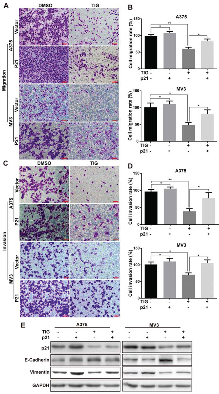 Overexpression of p21 retrieved tigecycline-induced cell migration and invasion suppression in human melanoma cells
