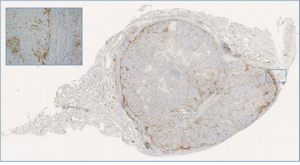Figure 2: A case of metastatic phyllodes tumor to the lung with peripheral PD-L1 expression adjacent to the inflammatory cells and normal lung parenchyma; of note this case harbored RB1 gene mutation in both primary and metastatic tumor.