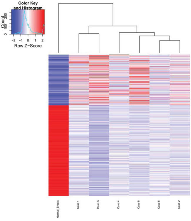 Figure 3: Gene expression signature of six phyllodes cases along with the normal breast tissue. In the heatmap, rows represent genes and columns represent samples. “Upregulated” (depicted in red) is defined as a transcript with transcript level that is > 2 fold relative to normal breast control and down regulated (depicted in blue) is defined as a transcript with transcript level that is < 2 fold relative to control. The expression of the normal breast is shown in the far left column.