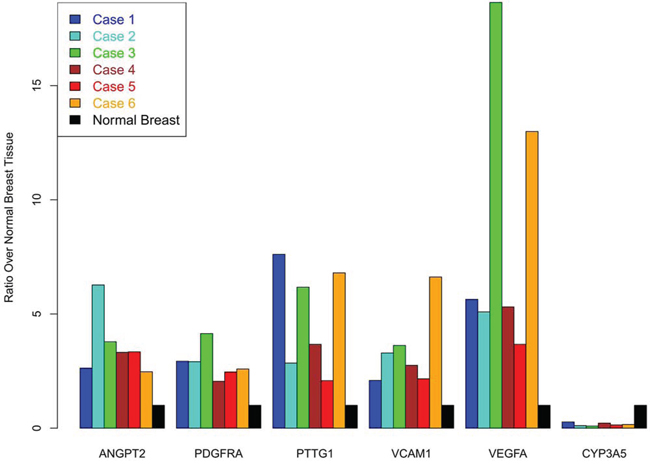 Figure 4: Bar plots for 6 angiogenesis markers found to be differentially regulated in Phyllodes cases when compared to normal breast tissue. The height represents the ratio of expression for the gene in the phyllodes case over the expression in the normal breast. For CYP3A5, three phyllodes cases had no detectable expression of the transcript and the values are depicted as 0 ratio. Normal breast expression ratio is set to ‘1’ for all 6 biomarkers and is depicted as the ‘black’ bar for all 6 genes.