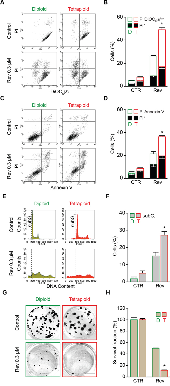 Figure 1: Preferential killing of tetraploid tumor cells by reversine-mediated MPS1 inhibition. A. and B. Diploid and tetraploid human colorectal carcinoma HCT 116 cells (framed in green and red, respectively) were left untreated or treated for 72 hours (h) with 0.3 μM reversine and then co-stained with the vital dye propidium iodure (PI) and the mitochondrial membrane potential (Δψm)-sensing dye DiOC6(3) for the evaluation of cell death–associated parameters by cytofluorometry. Representative plots are showed in panel (A), while quantitative data are represented in panel (B). In panel (B) white and black columns depict the percentage of dying (PI−DiOC6(3)low) and dead (PI+) cells, respectively. C. and D. Diploid and tetraploid HCT 116 cells (framed in green and red, respectively) administered or not with 0.3 μM reversine for 72 h were stained for the cytofluorometric detection of phosphatidylserine exposure with Alexa Fluor 488-conjugated Annexin V. Representative dot plots and quantitative data are reported in panels (C) and (D), respectively. In panel (D) white columns depict the percentage of dying cells (PI−Annexin V+) while black columns illustrate dead cells (PI+). E. and F. Diploid and tetraploid HCT 116 cells (framed in green and red, respectively) left untreated or exposed for 72 h with 0.3 μM reversine were fixed with ethanol and labelled with the DNA dye PI, for the quantification of the hypodiploid, subG1 apoptotic population. Representative plots (E) and quantitative data (F) are reported. G. and H. Diploid and tetraploid HCT 116 cells (framed in green and red, respectively) seeded at low cell density were left untreated or exposed to 0.3 μM reversine for 24 h. Upon drug washout, cells were cultivated for 15 days in fresh, drug-free medium before crystal violet staining and colony counting. Representative images of the plates (scale bar = 1 cm) (G) as well as quantitative data obtained upon normalization to plating efficiency (H) are shown. In panel (B), (D), (F) and (H) data are reported as means ± SEM (n ≥ 3). *p < 0.001 (Mann–Whitney test), as compared with diploid subjected to the same treatment condition. CTR, control; diploid, D; tetraploid, T; reversine, Rev.