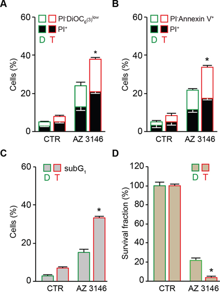 Figure 2: Preferential killing of tetraploid tumor cells by AZ 3146-mediated MPS1 inhibition. A. and B. Diploid and tetraploid human colon carcinoma HCT 116 cells (framed in green and red, respectively) were left untreated or treated with 5 μM AZ 3146 for 72 hours (h) and then either co-stained with the vital dye propidium iodure (PI) and the mitochondrial membrane potential (Δψm)-sensing dye DiOC6(3) (A) or stained with the phosphatidylserine binding protein Annexin V conjugated to Alexa Fluor 488 for the evaluation of cell death–associated parameters by cytofluorometry. In panel (A) white and black columns depict the percentage of dying (PI− DiOC6(3)low) and dead (PI+) cells, respectively. In panel (B) white and black columns illustrate the percentage of dying (PI−Annexin V+) and dead (PI+) cells, respectively. C. Diploid and tetraploid HCT 116 cells (framed in green and red, respectively) left untreated or exposed for 72 h with 5 μM AZ 3146 were fixed with ethanol and labelled with the DNA dye PI, for the quantification of the hypodiploid, subG1 apoptotic population. Quantitative data are reported. D. Diploid and tetraploid HCT 116 cells (framed in green and red, respectively) seeded at low cell density, were left untreated or exposed to 5 μM AZ 3146 for 24 h. Upon drug washout, cells were cultivated for 15 days in fresh, drug-free medium before crystal violet staining and colony counting. Quantitative data obtained upon normalization to plating efficiency are shown. In all the panels data are reported as means ± SEM (n ≥ 3). *p < 0.001 (Mann–Whitney test), as compared with diploid cells subjected to the same treatment condition. Diploid, D; tetraploid, T.