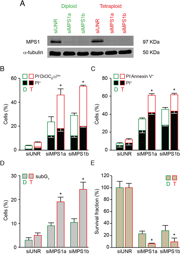 In this study we developed a novel strategy for targeting tetraploid tumor cells based on the abrogation of the mitotic kinase MPS1. By employing different pairs of tumor clones generated from the same parental cell lines and displaying distinct levels of ploidy (i.e., diploid vs. tetraploid) we provided strong evidence that the depletion or inhibition of MPS1 potently kills tetraploid cancer cells (and to a lesser extent diploid cancer cells) via a mechanism involving the induction of mitotic catastrophe following aberrant or aborted cell divisions, and the activation of a mitochondrion- and caspase-dependent pathway of regulated cell death.