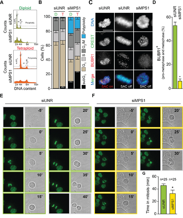 Figure 4: MPS1 abrogation shortens mitosis and abolishes SAC in tetraploid tumor cells. A. and B. Diploid and tetraploid human colorectal carcinoma HCT 116 cells (framed in green and red, respectively) were transfected with an unrelated small interfering (si) RNA (siUNR) or a specific siRNA directed against MPS1 (siMPS1) for 72 hours (h) and then fixed and stained with propidium iodure for the cytofluorometric assessment of cell cycle progression. Cell cycle distribution analyzed by flow cytometry for diploid and tetraploid cells is displayed in panel (A). Quantitative data (means ± SEM; n = 3) of the corresponding flow cytometry profiles are plotted in panel (B). Diploid, D; tetraploid, T. C. and D. Tetraploid HCT 116 cells were transfected with siUNR or siMPS1 for 24 h, treated with 20 μM MG132 for 4 h (a relatively short time to avoid increasing the risk of putative side effects unrelated to mitosis) and then processed for the immunofluorescence-assisted detection of spindle assembly checkpoint (SAC) activation as indicated by the localization of BUBR1 at CREST-labelled kinetochores. In panel (C) representative microphotographs of a normal prometaphase (SAC on), a normal metaphase (SAC off), and an abnormal metaphase (SAC off) in cells transfected with the indicated siRNA are reported. Scale bar = 10 μm. In panel (D) representing quantitative data, columns illustrate the percentage of prometaphases plus metaphases exhibiting SAC activation. Data are reported as means ± SEM (n = 3). *p < 0.01 (two-tailed t test), as compared with siUNR transfected tetraploid cells. E–G. Tetraploid HCT 116 cells expressing a green fluorescent protein-tagged variant of histone 2B (H2B-GFP) chimera were transfected with siUNR or siMPS1 and then monitored by live videomicroscopy for approximately 24 h to determine the time spent in mitosis. Image were taken every 5 minutes. Representative snapshots of siUNR- and siMPS1-transfected tetraploid mitosis are shown in panel (E) and (F), respectively, while quantitative data (means ± SEM) are reported in panel (G) (n = 25). p < 0.01 (two-tailed t test), as compared with siUNR transfected tetraploid cells. Full-length movies are provided as Supplementary Movies 1–4.