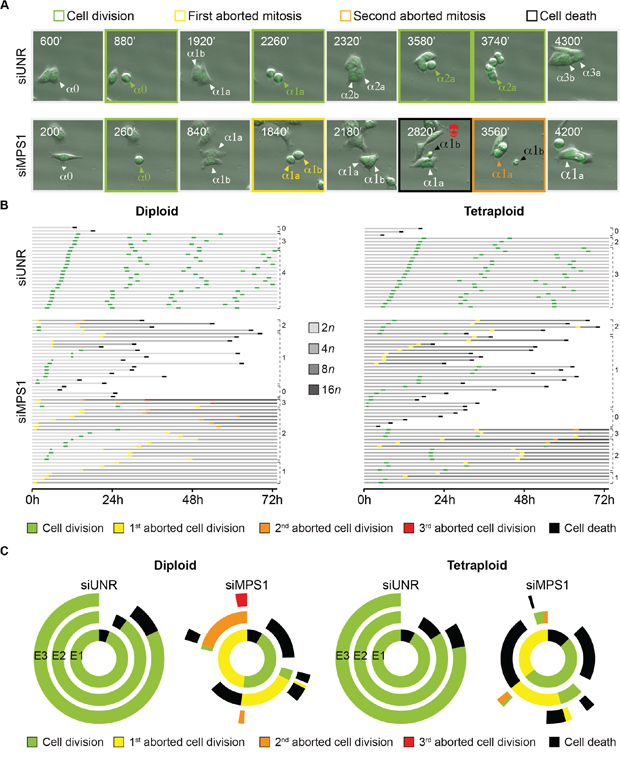Figure 5: Cell fate profiling of diploid and tetraploid tumor cells depleted of MPS1. A–C. Diploid and tetraploid human colorectal carcinoma HCT 116 cells stably expressing a green fluorescent protein-tagged variant of histone 2B (H2B-GFP) chimera were transfected with an unrelated small interfering (si) RNA (siUNR) or a specific siRNA directed against MPS1 (siMPS1) and then monitored by live videomicroscopy for 72 hours (h). Representative snapshots of tetraploid cells transfected as indicated are shown in panel (A), whereas single cell fate profiles of siUNR- or siMPS1-transfected diploid (n = 25) and tetraploid (n = 50), and transgenerational cell fate profiles of siUNR or siMPS1 transfected cells (n >100) are depicted in panel (B) and (C), respectively. In panel (A) alphas (α) indicate individual cells, whose sequential cell divisions are numbered with “0”, “1”,“2” and “3”. The two daughter cells of a bipolar division are depicted with “a” and “b”; while the single cell derived by an abortive division is indicated by an increase in the size type. The snapshots showing successful cell divisions are framed in green, while those showing the first and second abortive cell divisions are framed in yellow and orange, respectively. The snapshot framed in black highlights the death of one cell following an abortive mitosis. In panel (B) horizontal columns represent single cells over the time, as indicated in hours. The color code depicting successful (green) or aborted (yellow, orange and red) cell divisions, as well as cell death (black) is used as in panel (A). The increase in cell ploidy following abortive cell division is represented by grey darkening, while numbers indicate mitotic events (i.e., successful or abortive cell division). Please note that cell divisions were considered to be successful only when daughter cells were clearly separated. In panel (C) concentric circles depict three consecutive generational events (E), starting from E1 (inner circle), using the same color code as used in panel (A) and (B). Full-length movies are provided as Supplementary Movies 5 and 6.